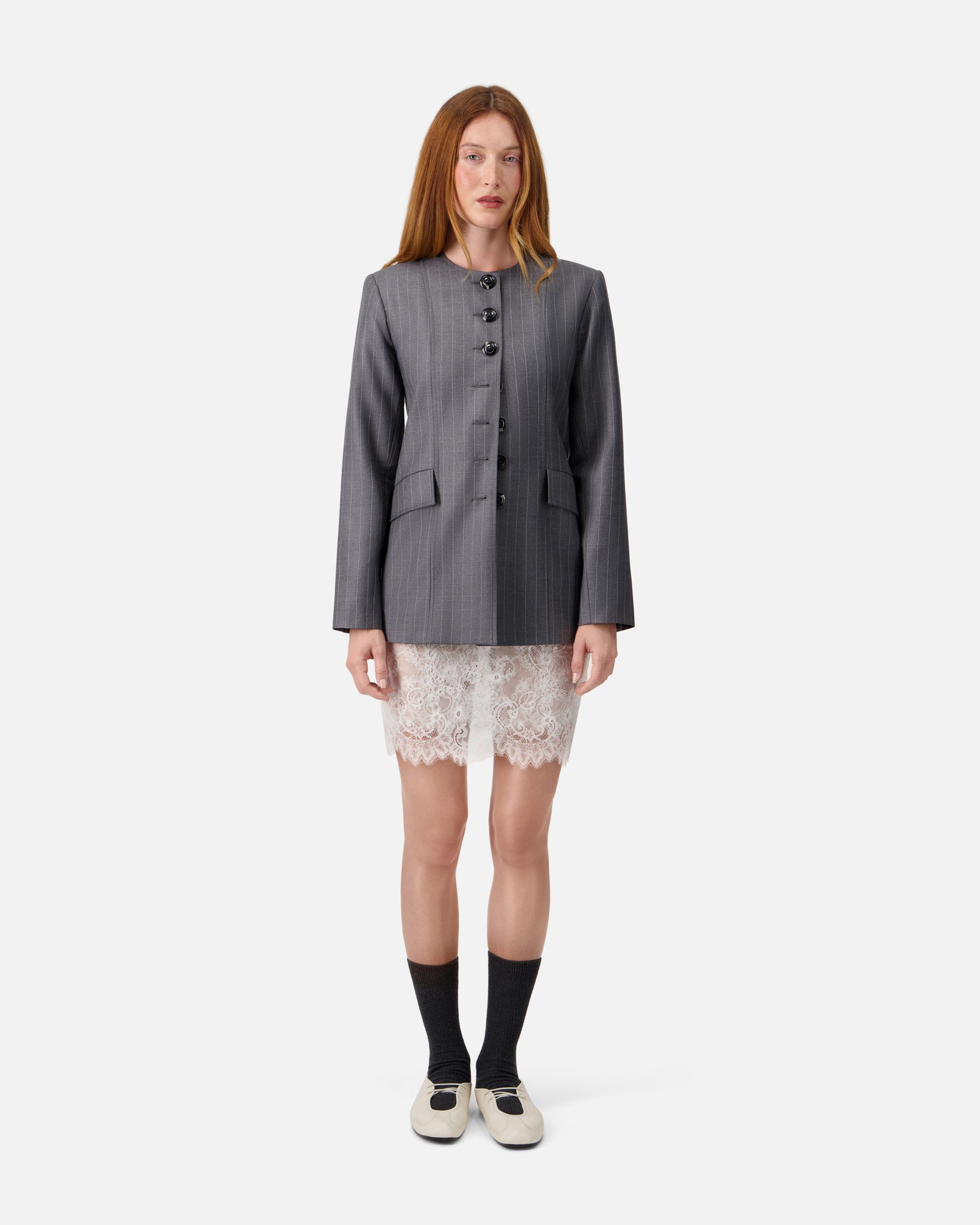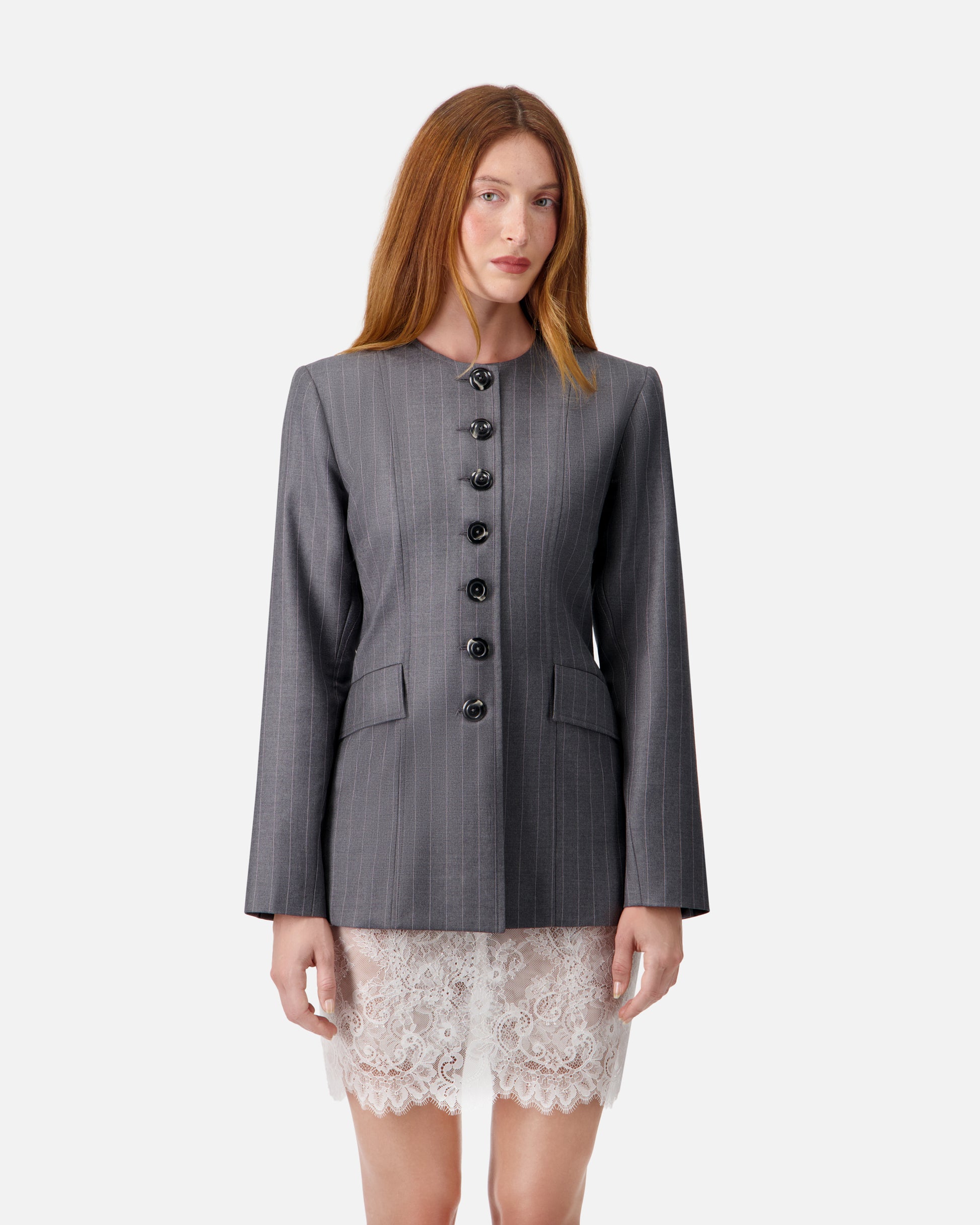 A tailored jacket in Italian  wool with a subtle pinstripe pattern.