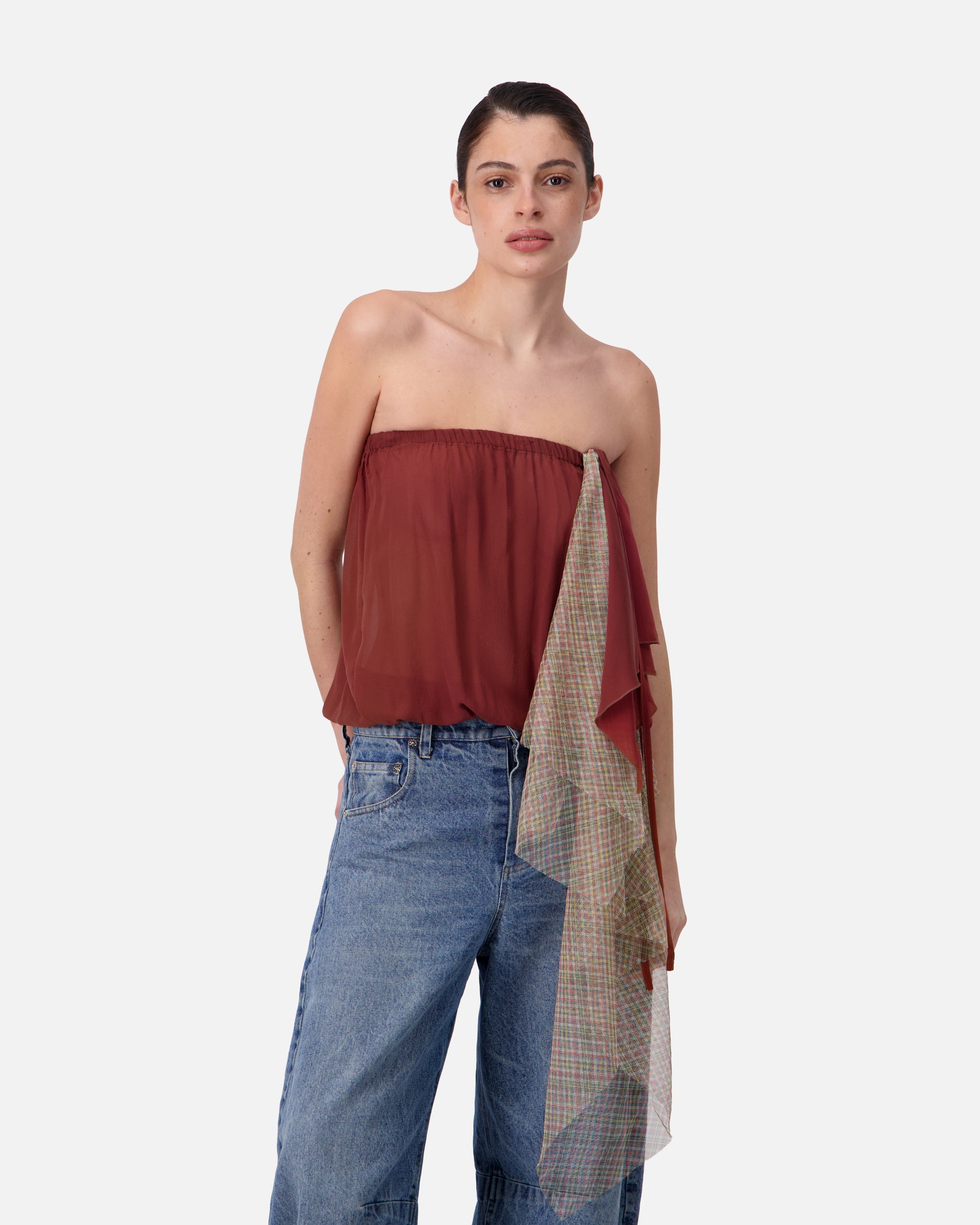 A strapless silk chiffon top with soft gathers for an airy, feminine silhouette.